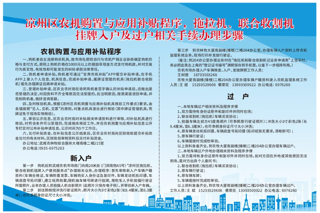为进一步提升服务效能,更好地服务广大农机用户,凉州区农业农村局决定将拖拉机、联合收割机挂牌入户便民服务点从武威农机市场南大门东侧E-5号搬迁至西门口向南20米通道南侧A-5号,即日起对外办公。新搬迁的便民服务点地理位置更加优越,与武威农机装备产业园仅一栏之隔,将更大程度方便南北市场购机农户就近快捷办理车辆核查及挂牌入户手续。