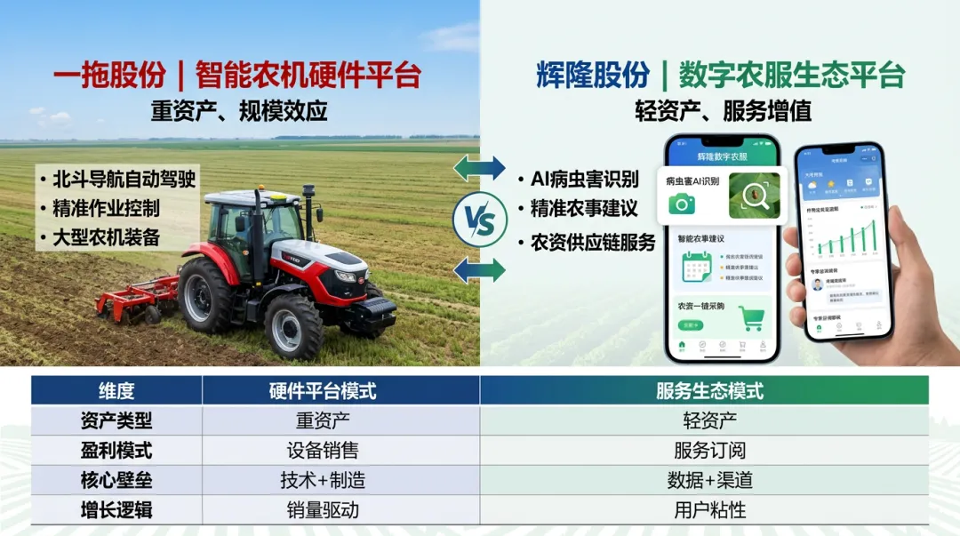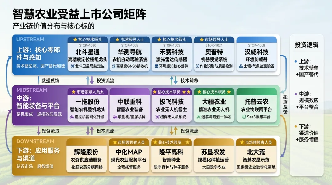 在黑龙江的万顷黑土地上,无人驾驶的拖拉机依托北斗导航进行厘米级精耕;在山东的麦田里,手机APP扫一扫就能AI识别病虫害并开具“药方”……这不再是零星试点,而是全国范围内的规模化落地。 报道数据显示,这些“黑科技”能让亩均用工减少30%、化肥减量12%。这背后,是一场关乎粮食安全与国家“新质生产力”战略的深刻产业变革。 今天,我们就来拆解这场“静悄悄的革命”背后的产业链与投资逻辑。 产业跃迁:从“四肢”到“大脑”的进化 智慧农业的本质,是构建一个“感知-决策-执行”的闭环系统。它让农业生产从依赖经验和体力,转向依赖数据和算法。 感知层(眼睛与神经): 北斗/GPS、物联网传感器、遥感卫星、AI摄像头,负责收集土壤墒情、作物长势、气候环境等全方位数据。 决策层(大脑): 农业大数据平台和AI算法,对海量数据进行分析,做出“何时浇、浇多少、何处施肥”的最优决策。 执行层(手脚): 无人农机、变量施肥机、智能灌溉系统,精准执行大脑的指令。 这个过程,标志着中国农业正从“机械化”1.0时代,系统性迈入以数据驱动为核心的“智能化、绿色化”2.0时代。其核心驱动力,一方面是应对农村劳动力结构性短缺和老龄化,另一方面是实现“藏粮于地、藏粮于技”的国家战略。 这场变革催生了一条清晰的价值链,不同环节的公司扮演着不同角色,共同分享这场万亿级产业升级的红利。 上游“技术赋能者”:提供核心技术与部件。如北斗星通、华测导航提供高精度定位模组与解决方案,是智能农机的“眼睛”;商汤科技、托普云农等提供AI视觉识别算法,是作物的“诊断医生”。它们是智慧农业的“标配”供应商,技术壁垒是其护城河。 中游“硬件平台商”:提供智能作业载体。如一拖股份作为智能拖拉机平台制造商,潍柴动力提供绿色高效动力总成。它们将上游技术集成到可靠的硬件中,是直接面向农田的“卖铲人”,其规模制造、渠道网络和品牌信誉构成核心优势。 下游“场景运营与整合者”:提供综合解决方案与服务。如北大荒依托其规模化农场,成为智慧农业技术的最佳应用样板和试验田;辉隆股份则利用其庞大的农资流通网络,向“农资+数字服务”转型。它们通过模式创新,将技术价值转化为可持续的商业模式。 龙头深潜:谁在构建新时代的护城河? 我们选取产业链中两个最具代表性的龙头,进行深入剖析,看看它们如何在这场变革中构筑新的竞争壁垒。 中游硬核代表:一拖股份——从“制造巨头”到“智能平台”