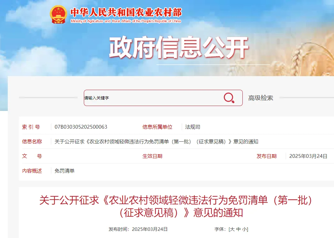 为贯彻落实党中央、国务院决策部署,指导各地准确适用过罚相当原则,规范涉企行政执法行为,进一步优化营商环境,切实维护企业和群众合法权益,我部研究起草了《农业农村领域轻微违法行为免罚清单(第一批)(征求意见稿)》(见附件),现向社会公开征求意见。欢迎有关单位和个人提出修改意见,并于2025年4月6日前反馈农业农村部。公众可通过以下途径和方式提出意见:一、通过电子邮件发送至fgs@agri.gov.cn,邮件主题请注明“农业农村领域轻微违法行为免罚清单(第一批)公开征求意见”。二、通过信函邮寄至北京市朝阳区农展馆南里11号,农业农村部法规司综合执法体系建设处收(邮编:100125),并在信封上注明“农业农村领域轻微违法行为免罚清单(第一批)公开征求意见”字样。