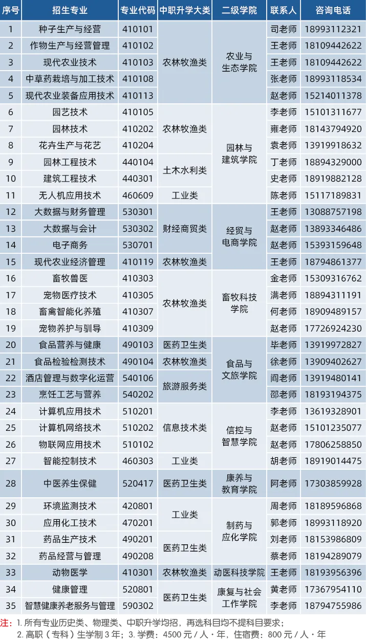 所有招生专业历史类、物理类均可报考,再选科目均不提要求,中职升学大类适配对应专业,各专业分属 13 个二级学院,涵盖农林牧渔、土木水利、财经商贸、信息技术、医药卫生等多个领域(具体专业、咨询方式详见学校官方完整版招生简章)。
