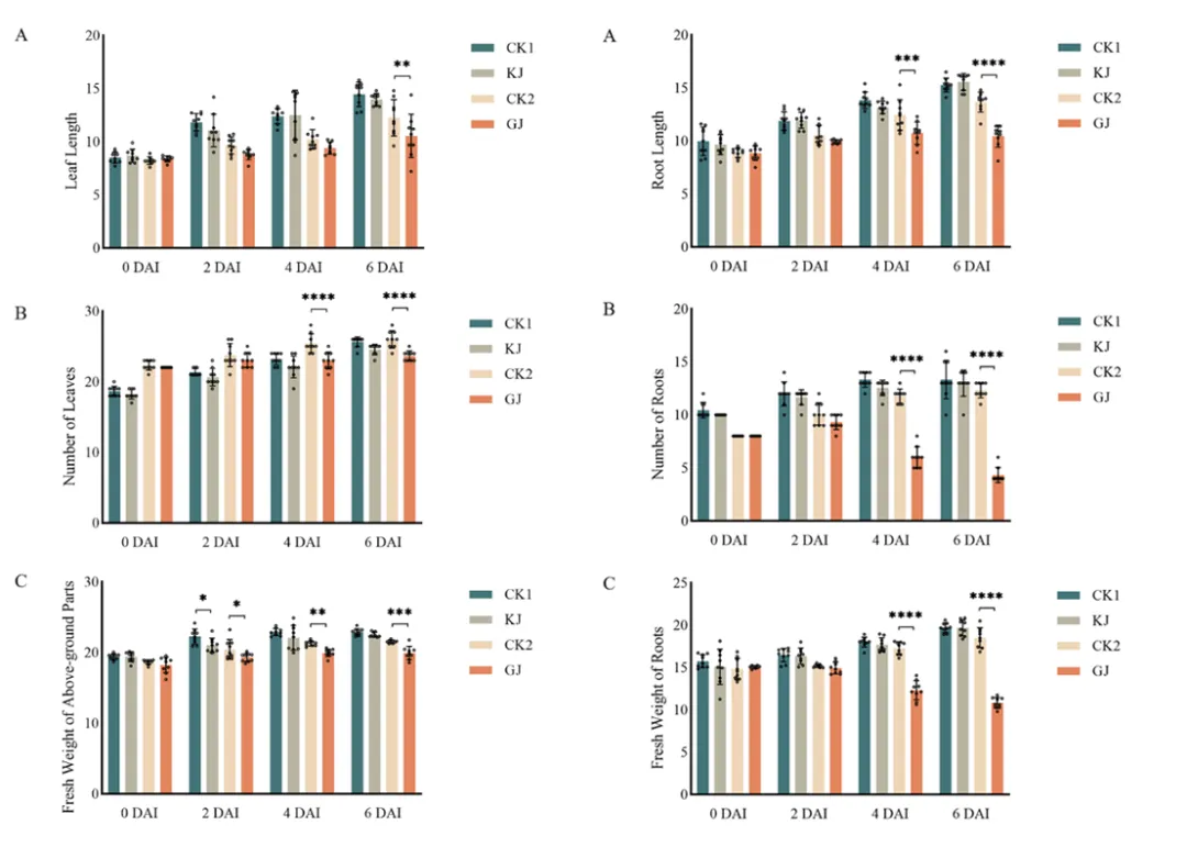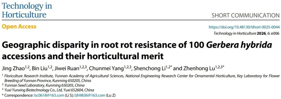 非洲菊(Gerbera hybrida)是重要的观赏花卉之一,因其花色丰富、花型优美而在切花和盆栽市场中占据重要地位。然而,根腐病作为制约非洲菊产业可持续发展的主要土传病害之一,近年来在生产中呈现高发态势,严重影响植株生长、商品品质及经济效益。该病害通常由多种土传病原菌单独或协同引起,其中疫霉属(Phytophthora)病原危害尤为严重。已有研究表明,Phytophthora cryptogea 是我国云南、福建等非洲菊主产区根腐病的主要致病菌。由于化学防治成本高、效果不稳定且易造成环境污染,培育和利用抗病品种被认为是防控根腐病最经济、最可持续的途径。2026年3月,Technology in Horticulture 在线发表了云南省农业科学院花卉研究所李绅崇、卢珍红团队题为Geographic Disparity in Root Rot Resistance of 100 Gerbera hybrida Accessions and Their Horticultural Merit 的短讯。该研究对 100 份非洲菊种质资源(77 份源自荷兰,23 份来自中国福建)的根腐病抗性进行了系统鉴定与分级评价,将其划分为高抗(HR)、抗病(R)、中抗(MR)、中感(MS)、感病(S)和高感(HS)六个抗性等级别,其中3个品种被鉴定为高抗材料,分别为 Midi Red BC、Maxi Yellow BC 和 Midi Eyecatcher Twilight BC;进一步选取 Midi Eyecatcher Twilight BC (HR)和Mini Orange BC(HS)两个品种人工接种隐地疫霉观察不同抗性品种的生长响应。在接种隐地疫霉后,高抗性品种Midi Eyecatcher Twilight BC,地上部分的叶长、叶数、鲜重和地下部分根的生长和鲜重没有显著差异(图2)。高感品种Mini Orange BC在接种后表现出叶片变黄和叶逐渐枯萎,导致叶片数量和茎鲜重减少,根在接种后出现了停止生长和枯萎,导致根长和鲜重明显低于对照组。表明隐地疫霉感染严重损害了Mini Orange BC的根系生长,导致根系变短、根系数量减少,根系鲜重降低,而Midi Eyecatcher Twilight BC在整个感染期间保持了相对正常的根系发育,这些结果为非洲菊抗病品种选育提供了新的思路,同时也为非洲菊产业发展提供了具体的技术支持。图2 接种隐地疫霉后高抗和高感品种的地上生长指标(左)和根系生长指标(右)比较(CK1、CK2为清水处理组;KJ为高抗品种;GJ为高感品种)云南省农业科学院花卉研究所非洲菊团队在相关领域的研究成果凝聚了团队多位科研人员的智慧与心血。该团队长期致力于非洲菊等观赏植物的遗传育种、栽培生理及生物技术应用研究。在该研究中,卢珍红和李绅崇为论文的通讯作者,主要负责研究工作的总体设计、方向把握以及论文的最终审阅与定稿。赵静为该论文第一作者。主要承担实验操作、数据分析和论文起草。该研究工作得到云南省农业科学院预研专项(2023KYZX-07)项目的资助。https://doi.org/10.48130/tihort-0025-0044相关推荐: