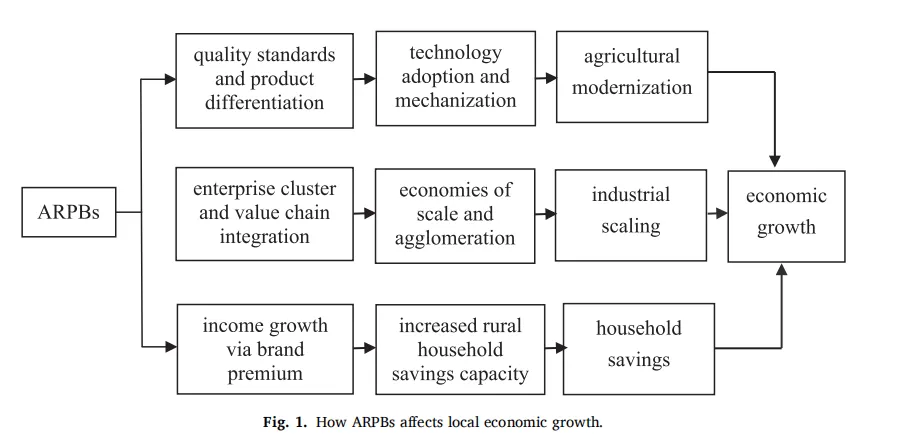 其次,ARPBs通过催化产业规模化,即促进农业企业集聚形成有竞争力的集群,来促进地方经济增长。从理论上讲,当生产者和农业企业联合在一个公共区域品牌下时,他们会形成一个受益于共享资源、降低交易成本和集体声誉的产业集群——这是经典集聚经济的一个例证(Porter, 1998; Kavaratzis, 2005)。这一逻辑与波特集群理论一致,该理论认为地理上集中的企业享有知识溢出和供应链效率,从而增强其区域竞争力。此外,区域公用品牌将一个地区与特定产品行业联系起来,形成一个不与任何单一企业生命周期挂钩的共享身份。这种集体身份为区域经济提供了持久的集聚效益;在中国,政策制定者明确将ARPBs的发展作为“促进农村振兴和农业产业化”的战略,从而有效地扩大了农业部门的规模(Zheng et al., 2022; Yang et al., 2024)。通过对标志性作物或食品进行品牌化,一个县可以在区域品牌框架下整合其从生产到加工再到营销的整个产业链。。