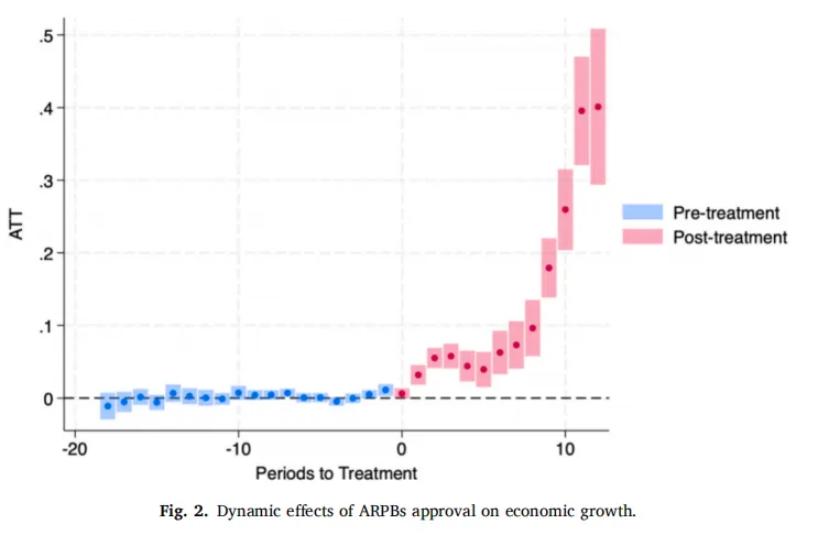 尽管ARPBs的政策相关性日益增强,但关于其经济影响的实证证据仍然稀缺。现有研究强调了它们提升产品声誉、促进供应链整合和支持地方产业的潜力(Ma & Qiao,2024;Zhang等人,2024)。此外,ARPB还可以通过区域产业集聚和新型农业经营主体促进农民收入增长,缩小城乡收入差距,并对周边地区产生积极的溢出效应(Yang等人,2025)。然而,仍存在显著差距:(1)严格的因果评估有限,大多数研究依赖于在交错采用设置中可能存在偏差的传统估计量;(2)连接ARPBs与县级增长的机制仍未得到充分研究;(3)对于不同发展阶段和制度设置下的潜在异质性知之甚少。
