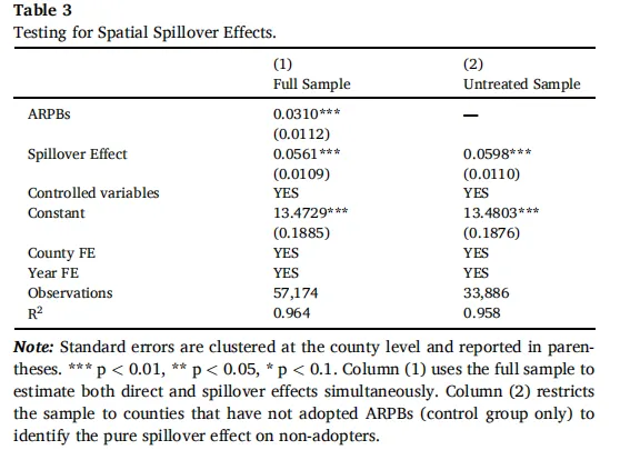 除了农业区域公共品牌对地方经济的直接影响外,考察该政策是否会在行政边界之间产生外部性也至关重要。从理论上讲,这种溢出效应的方向并不明确:如果品牌县吸引了邻县的资本和人才,则可能产生负面的“虹吸效应”;而如果该品牌增强了区域供应链和声誉,则可能产生正面的“集聚外部性”。为了严格检验这一假设,我们在基线双向固定效应(TWFE)模型的基础上,引入了处理变量的空间滞后项。根据空间滞后X(SLX)框(HalleckVega & Elhorst, 2015),模型设定如下: