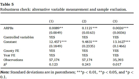 在两种模型设定下,农业区域公共品牌(ARPBs)的系数均为正,且在1%的水平上具有统计显著性。这表明,即便在最简约的设定下,农业区域公共品牌的采用也与地方经济成果的改善相关联。