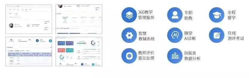 360教学管理服务,专职助教,全程督学,智慧教辅系统,随堂AI诊断,在线测评考试,教师评价和意见反馈,Bl报表数据分析