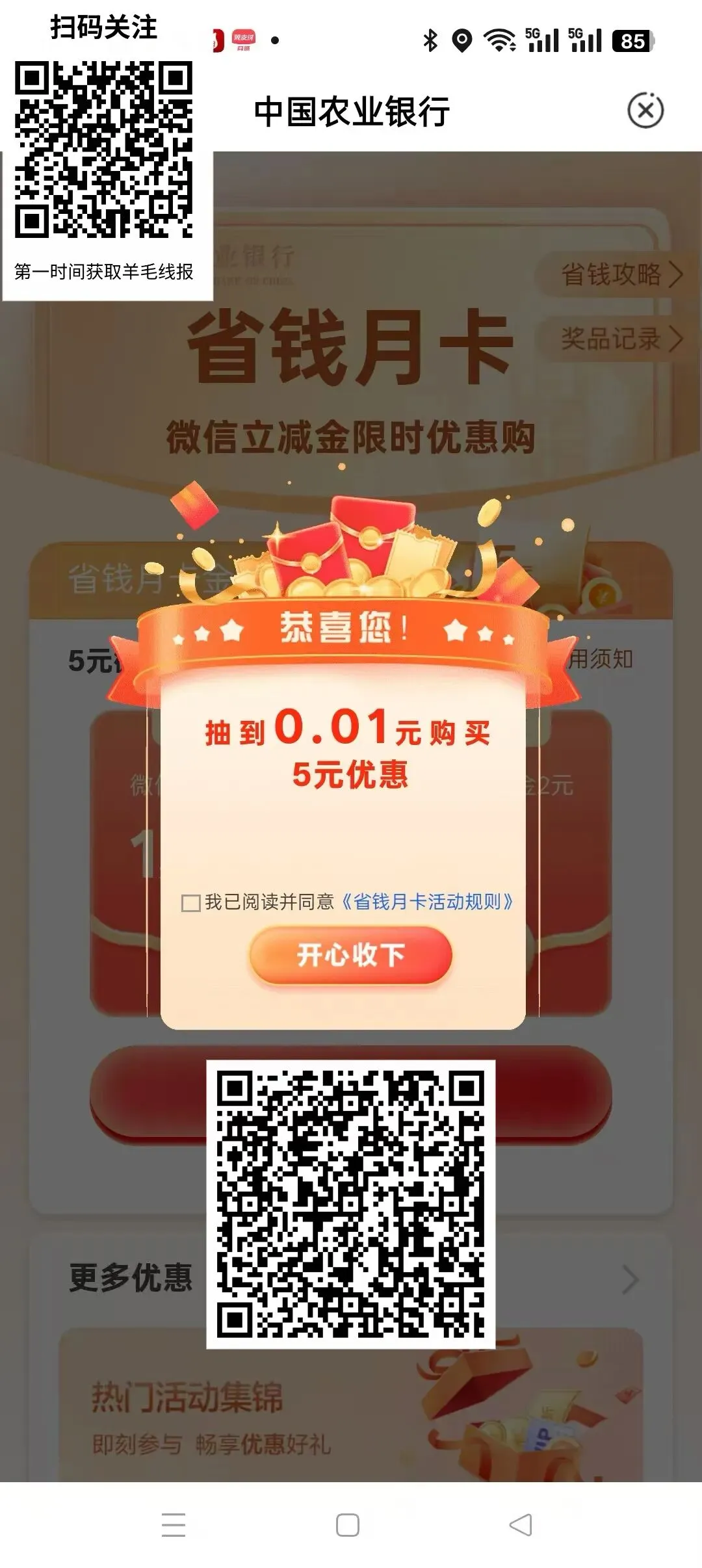 农行省钱月卡亲测0.01买5元微信立减金