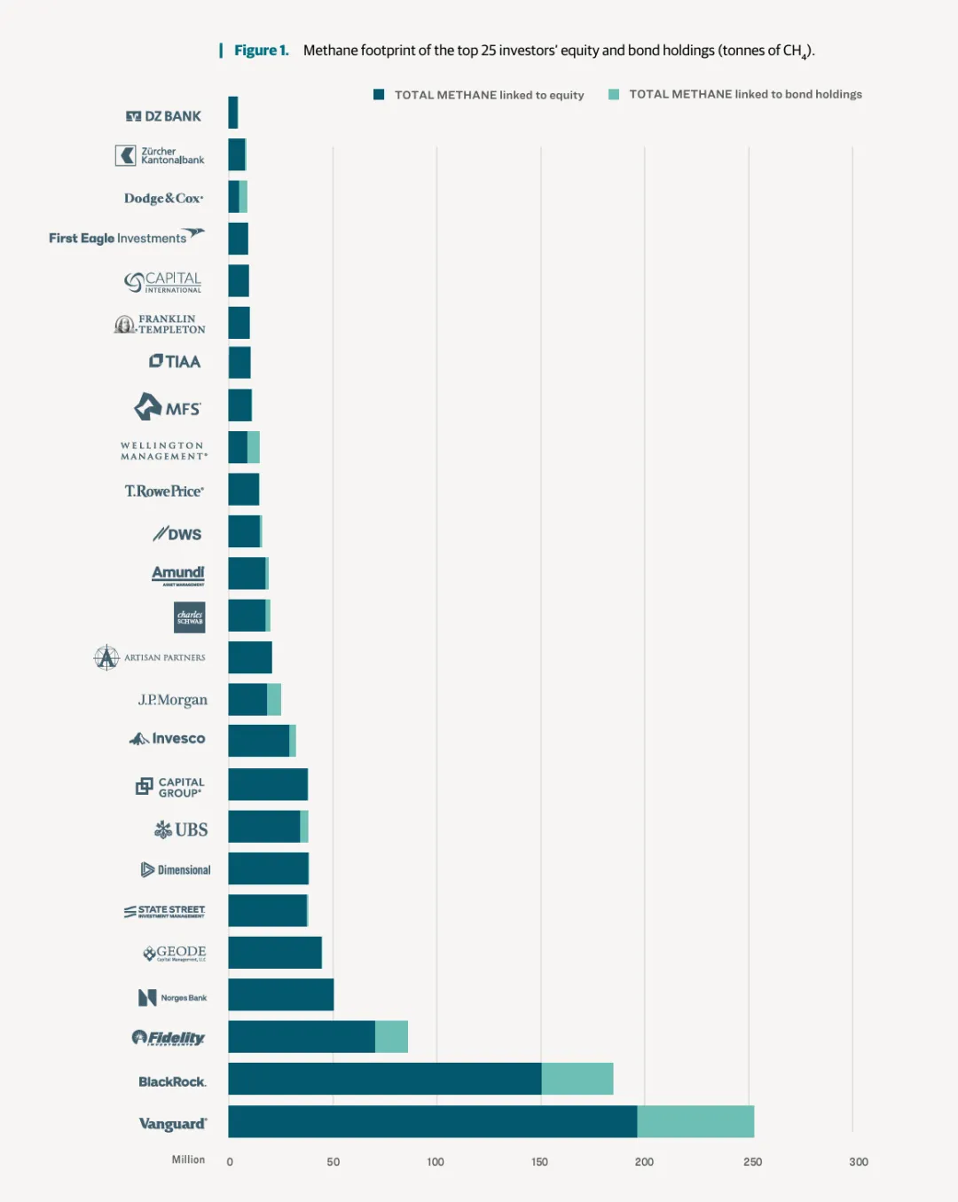 下图展示了全球主要投资者因其持仓而间接相关的农业甲烷排放总量。分析显示,少数几家机构,包括先锋领航、贝莱德和富达投资,通过其投资的肉类、乳制品和水稻相关企业,贡献了不成比例的融资甲烷排放份额。