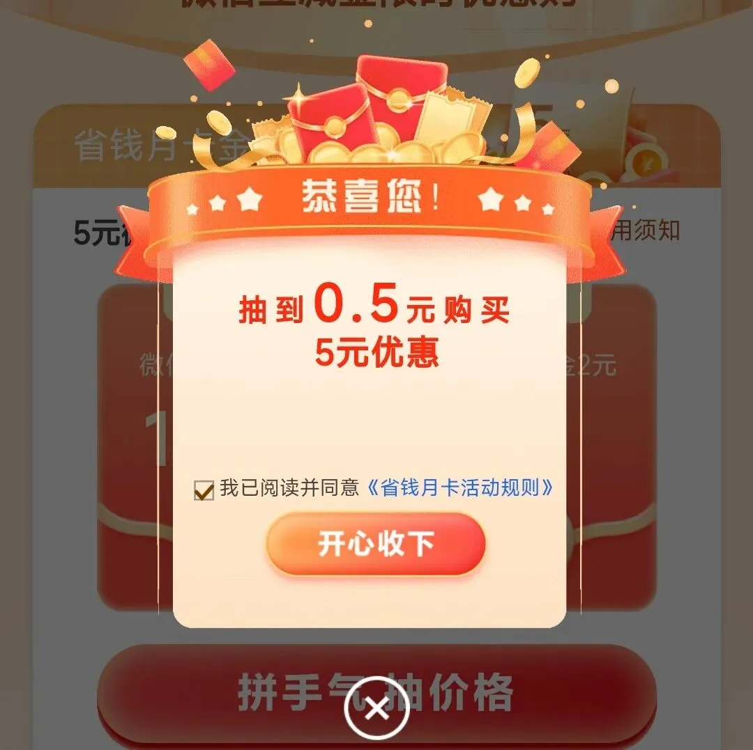 3. 活动详情:活动期间,您进入“省钱月卡”活动页面,可以优惠价格购买价值5元的优惠券包。优惠券包的价格通过开盲盒确定,券包内包含1张2元和3张1元的微信立减金。活动期间,同一客户仅有一次参与领奖的机会(符合同一身份证号、同一银行卡号、同一注册手机号、同一微信账号、同一设备等任一条件的,均视为“同一客户”)。共80万份优惠券包,活动名额有限,先到先得、用完即止。