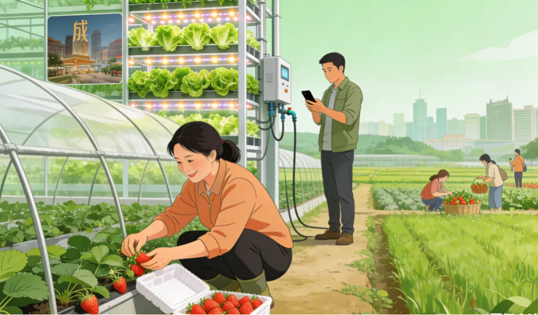 阳光穿过大棚,洒在邓素英的手背上,她正小心翼翼地把草莓放进泡沫盒,脸上带着笑意。不远处,李伟在调试喷灌系统,手机里传来客户的订单提醒;千里之外的成都,杨其长正记录着生菜的生长数据,灯光下的菜苗,长得郁郁葱葱。