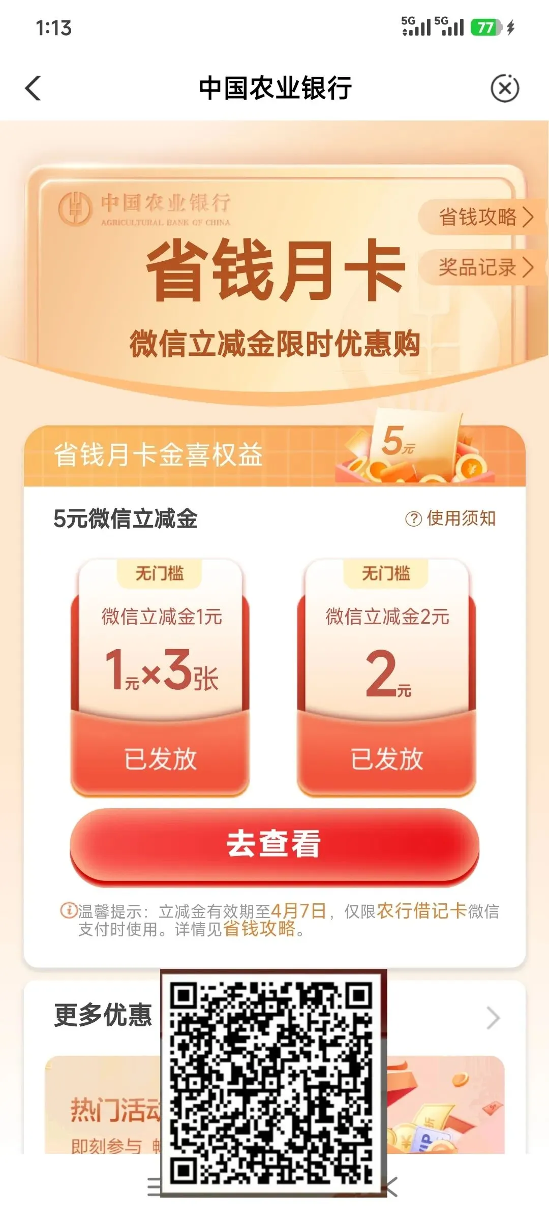 农行5元微信立减金,快领!