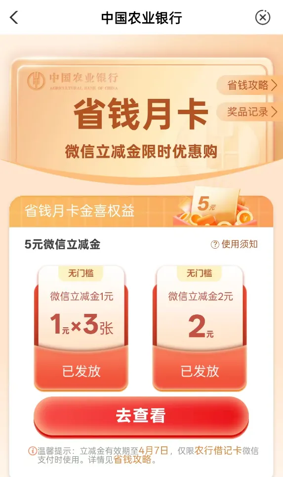 >农行5元微信立减金,快领!