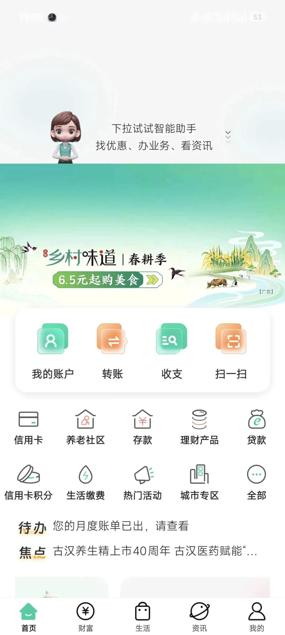 先把农业银行APP升级到最新版本,然后打开农业银行APP,按住首页不松手往下拉,记住了是往下拉,不是向下滑动,进入农业银行智能助手。