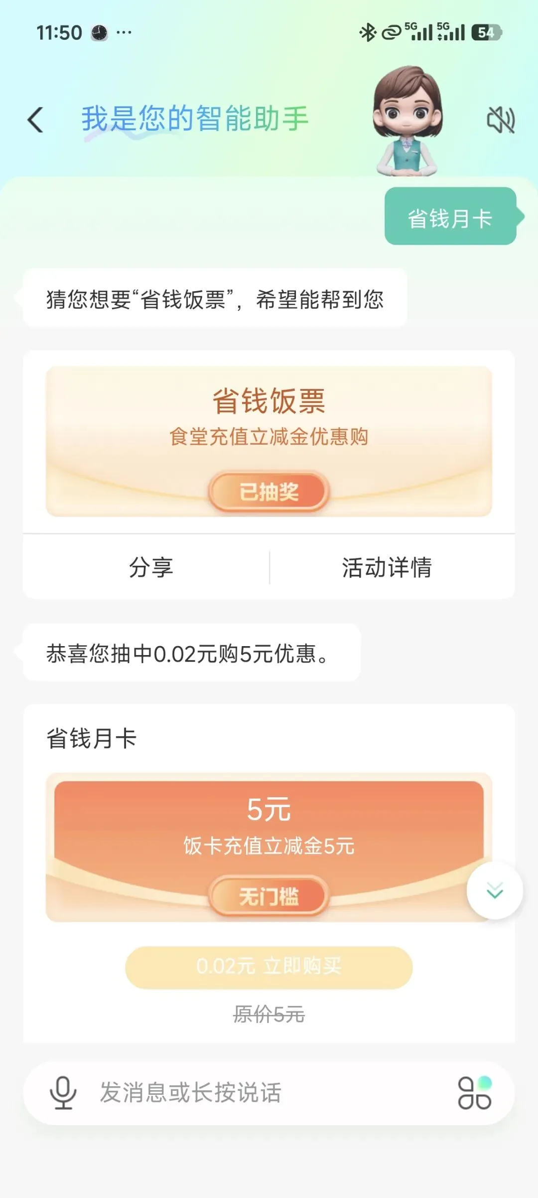 然后输入“省钱月卡”四个字,就会自动给你找到“省钱月卡”,然后就可以买了,很多人都是0.1元以下买5块钱的微信立减金,也有买到其他的人,比如我就是0.02元买到了5元的饭卡充值券。关键我又不是单位上的人,这饭卡对我好像也没啥用啊。