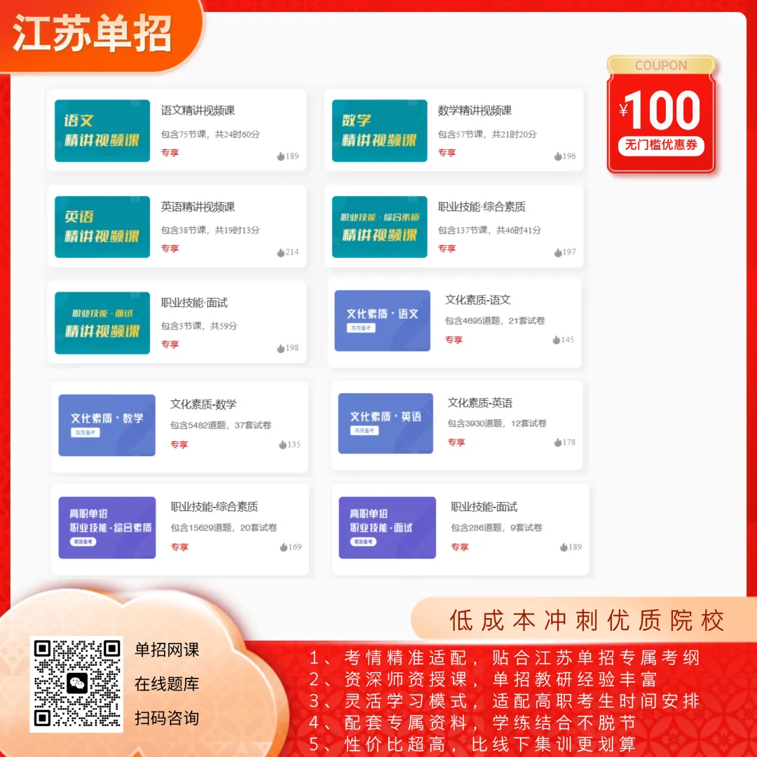 业务涵盖范围:江苏中考升学择校、规划服务,高职单招、职教高考提分集训营,高考志愿指导,专转本网校、集训营,专接本、本科助学班,成人学历提升服务,江苏升学规划、政策咨询、集训课程等服务;