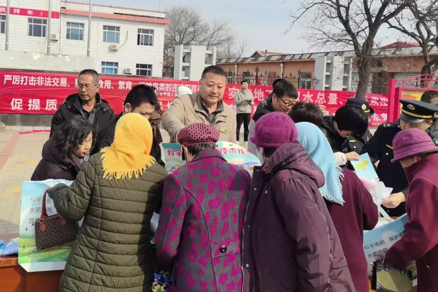此次活动聚焦群众生产生活实际需求,现场布设宣传展牌6块、悬挂宣传横幅8条,营造出浓厚的宣传氛围。工作人员主动向赶集群众发放宣传编织袋200余个,《化肥减量增效技术挂图》《节约用水条例》等各类宣传资料800余份,用通俗易懂的语言,面对面讲解农机安全操作规范、惠农补贴申领流程,解读野生动物保护法律法规、节水护水知识,同步宣讲森林防火、秸秆禁烧管控要求,耐心解答群众咨询的各类问题。