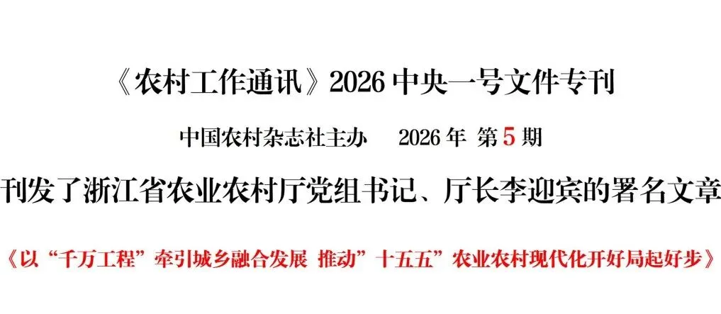 2026年中央一号文件专刊《农村工作通讯》最新刊发了 : 浙江省农业农村厅党组书记、厅长李迎宾的署名文章。文章系统阐述了浙江在“十五五”开局之年如何以“千万工程”为总牵引,全面推进城乡融合发展,奋力打造中国式农业农村现代化的省域范例。