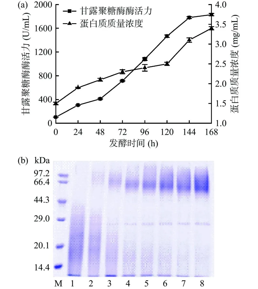 以重组质粒 pPIC9K-AnMan26 为模板,PCR 扩增目的基因,得到长度为 954 bp 的目的片段,经NotI 和 XhoI 双酶切后,与同样经过双酶切的载体Blunt-pyrG 连接,得到重组表达载体 Blunt-pyrGAnMan26。将 Blunt-pyrG-AnMan26 转化至黑曲霉工程菌 FBL-B 中,成功实现 AnMan26 的表达,随后对转化子进行筛选,选取摇瓶发酵酶活力最高(630 U/mL)的转化子在 5 L 发酵罐中进行高密度发酵。随着发酵进行,发酵液中 β-甘露聚糖酶的酶活力和蛋白含量均逐渐增加。发酵 168 h 后,β-甘露聚糖酶的酶活力达 1830 U/mL,蛋白浓度达 3.44 mg/mL(图 1a)。SDS-PAGE 分析表明,发酵开始后在66 kDa 附近检测到弥散的蛋白条带,即为 β-甘露聚糖酶蛋白条带,且蛋白条带逐渐变粗(图 1b)。