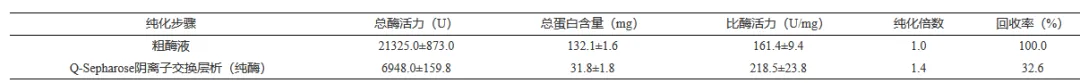 注:总酶活力(U)=酶液酶活力(U/mL)×酶液体积(mL);总蛋白含量(mg)=酶液蛋白浓度(mg/mL)×酶液体积(mL);比酶活力(U/mg)=总酶活力(U)/总蛋白含量(mg);纯化倍数=纯酶比酶活力(U/mg)/粗酶比酶活力(U/mg);回收率(%)=纯酶总酶活力(U)/粗酶总酶活力(U)×100。