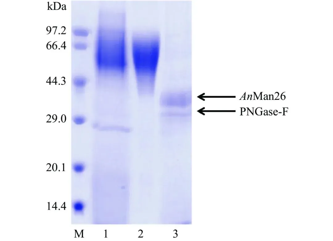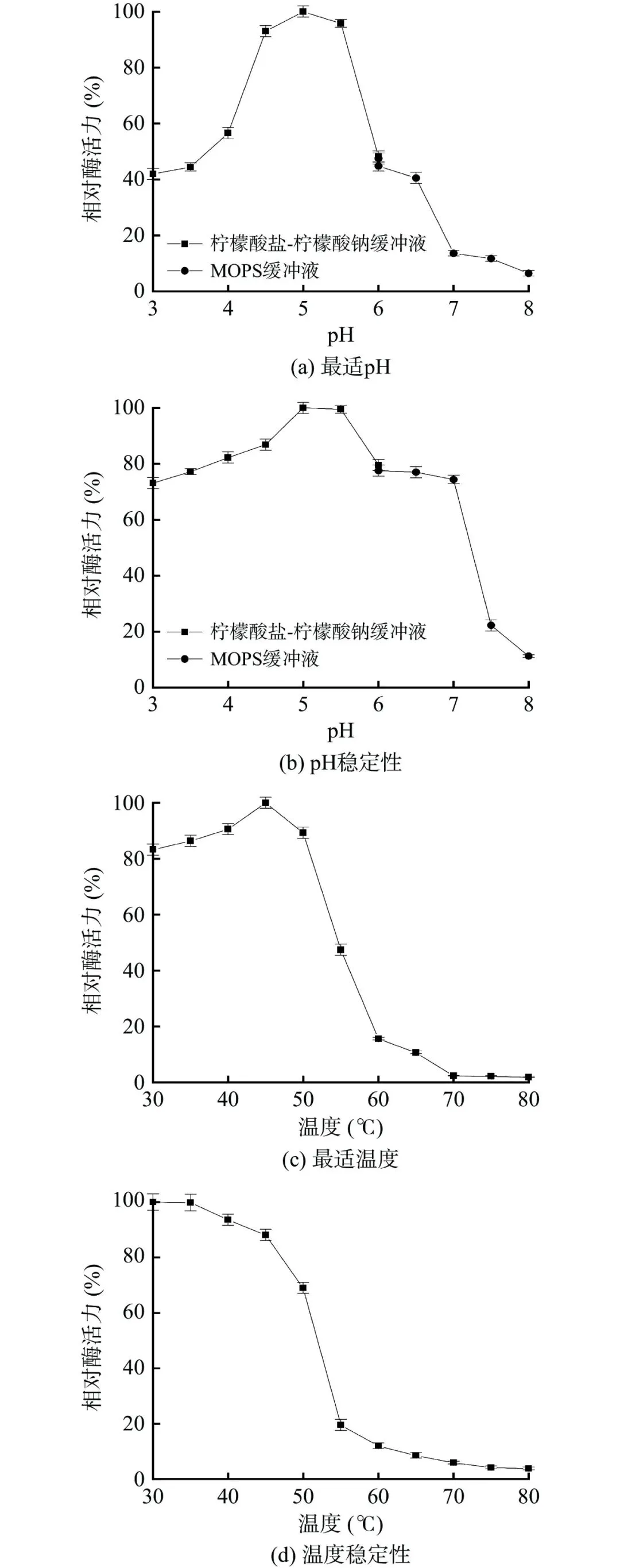 图 2 β-甘露聚糖酶(AnMan26)的纯化电泳图Fig.2 SDS-PAGE analysis of the purification of β-mannanase (AnMan26)注:M:低相对分子质量标准蛋白质;泳道 1:粗酶液;泳道 2:纯酶液;泳道 3:AnMan26 去糖基化。AnMan26 的最适 pH 为 5.0(图 3a),在 pH3.0~7.0 下具有良好的稳定性,处理 30 min 后,仍保留70% 以上的残余酶活力(图 3b)。该酶的最适温度为 45 ℃(图 3c),在 45 ℃ 以下具有良好的稳定性,处理 30 min 后仍有 80% 以上的残余酶活力(图 3d)。与在毕赤酵母中表达相比,AnMan26 在黑曲霉中的最适 pH 没有发生变化。AnMan26 能够在pH3.0 下仍保持 70% 以上的残余酶活力,说明该酶具有良好的耐酸性,明显优于枯草芽孢杆菌 YZ-21来源的 β-甘露聚糖酶 ManA(pH3.0 下残余酶活力为 15%)和多粘类芽孢杆菌(P. polymyxa)来源的 PpMan26A(pH3.0 下残余酶活力几乎为 0)。