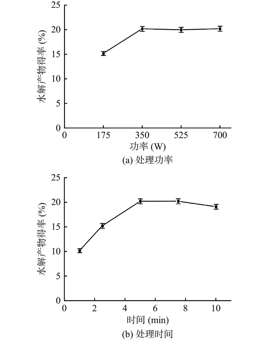 Fig.4 Effect of treatment power and time on hydrolysate yield处理功率和处理时间是微波处理效果的两大影响因素。经微波处理后的咖啡渣内部结构更松散,增加甘露聚糖酶与底物的接触面积。微波处理方法相比于蒸汽爆破等其他物理化学方法,具有装备复杂性低、能耗低的优点。在最佳微波处理条件下(350 W,5 min),咖啡渣的水解率达 42.3%,水解产物得率达 20.3%,效果优于已报道的大部分 β-甘露聚糖酶。Yoo 等利用链霉菌(Streptomycetaceae sp.)来源的 β-甘露聚糖酶 Man147 水解咖啡渣,咖啡渣中的甘露聚糖水解率仅为 18%。Chiyanzu 等用棘孢曲霉来源的 β-甘露聚糖酶和纤维素酶复配水解咖啡渣,甘露寡糖的产量为 14.64%。因此,利用微波处理咖啡渣后进行 AnMan26 和 α-半乳糖苷酶复配水解是一种有效的制备甘露糖和甘露寡糖的方法。