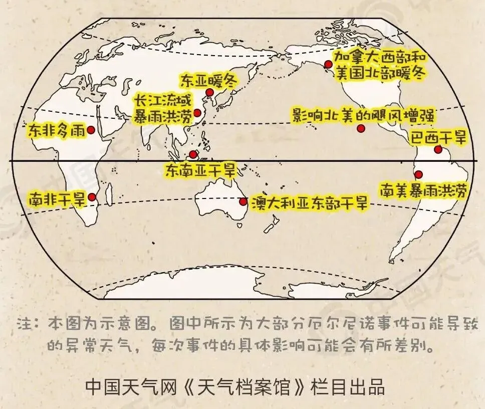 ▲厄尔尼诺对全球气候的影响(来源:中国天气网)