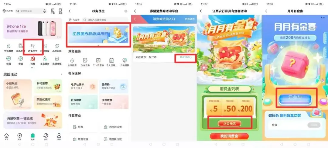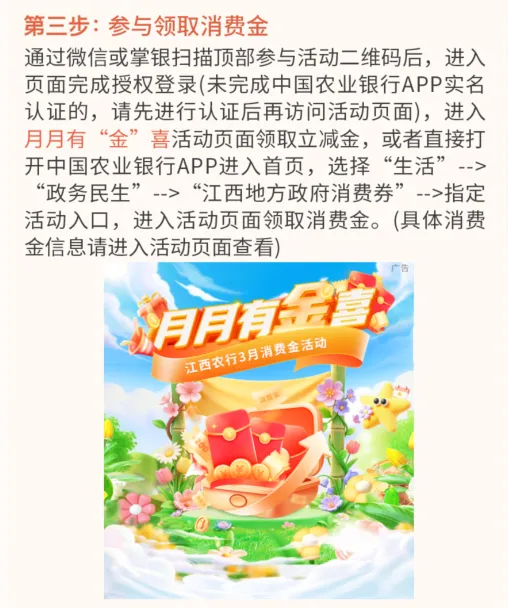 3、进入农行掌银APP“生活”-“政务民生”,点击“江西地方政府消费券”-“月月有‘金’喜”,进入活动页面参加活动。