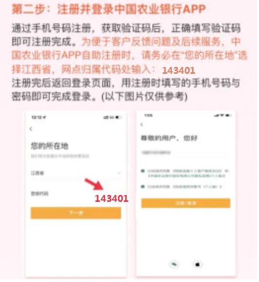 2、为便于客户反馈问题及后续服务,中国农业银行APP自助注册时,请在所在地选江西,输入代码14340。