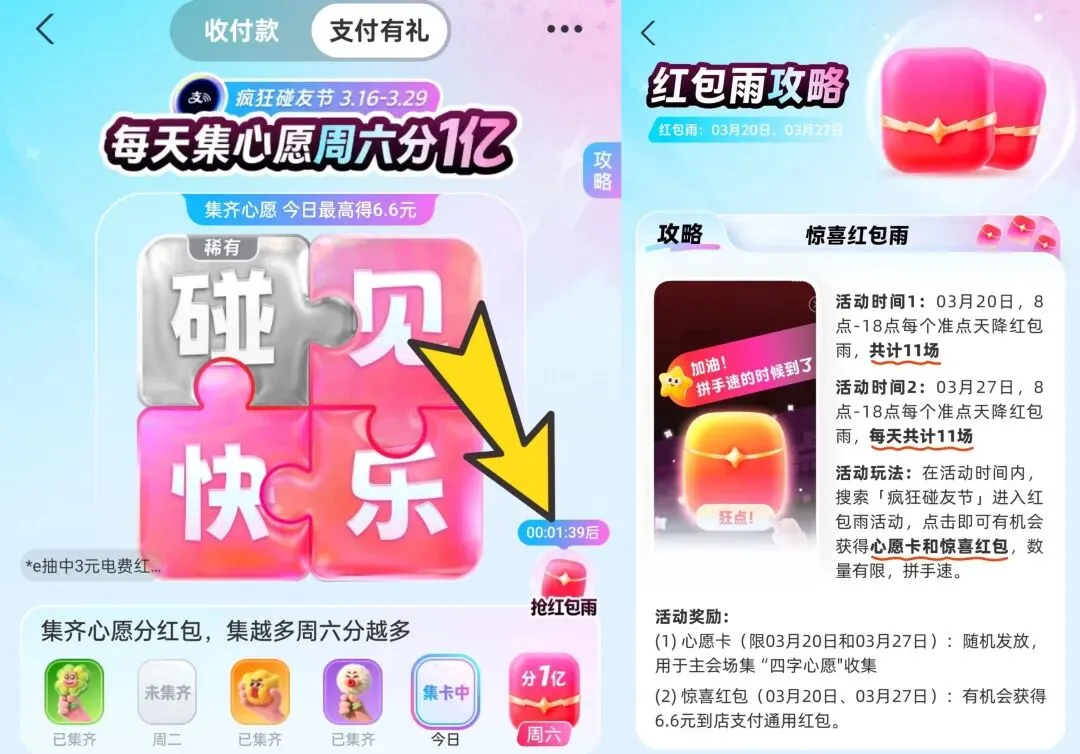 ❶打开支付宝,搜索:支付有礼 / 疯狂碰友节,今日8-18点每个整点天降红包雨