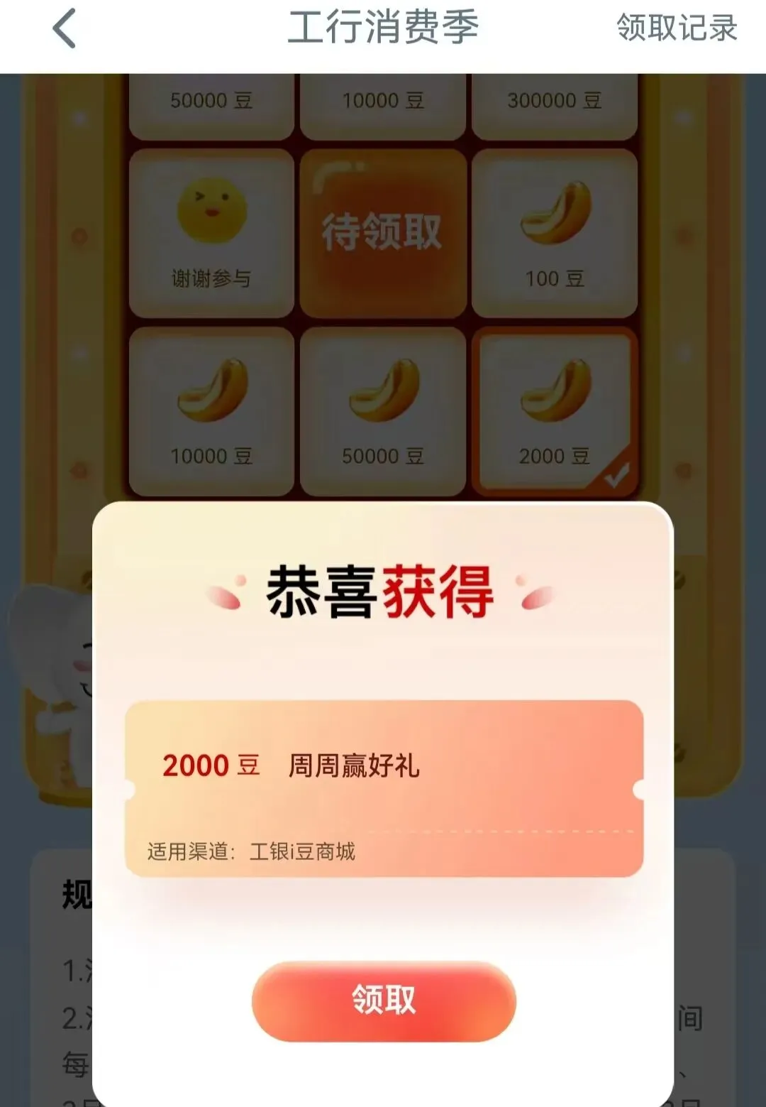 ❶工行app搜—工行消费季,每周五六日抽豆
