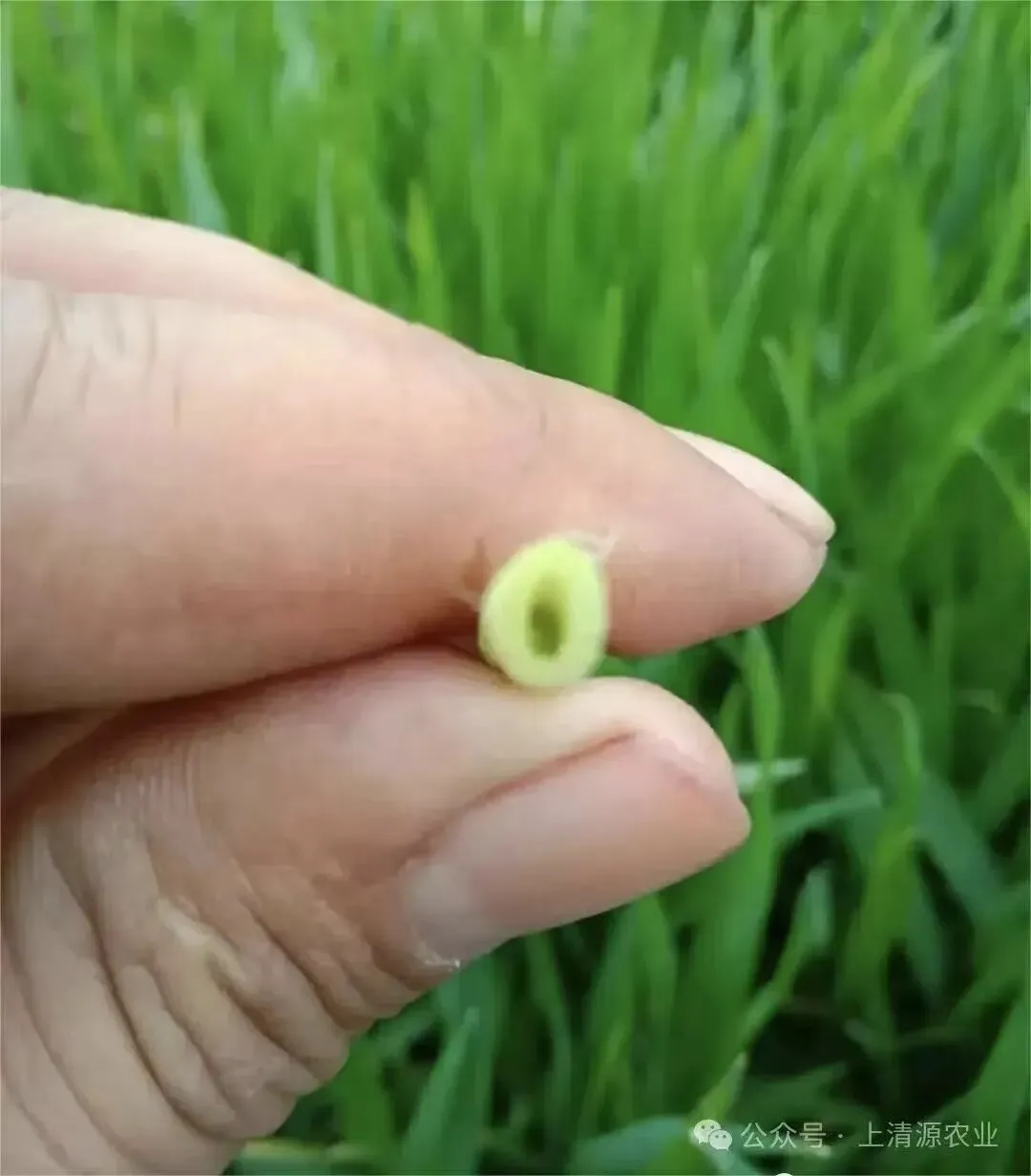 就是拿一个小剪刀或者指甲刀,从根儿往上大约1.5厘米左右,然后我们把它给掐掉或剪断。看一下横切面儿,如果是一个空心的,说明小麦已经拔节,如果是一个实心的,说明麦子还没拔节。