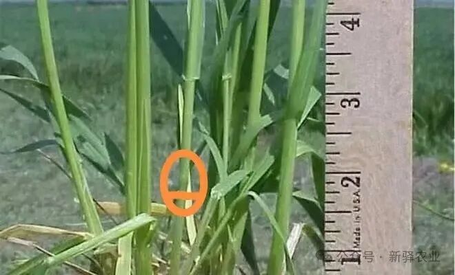 如果用手摸不明显时,还可以在地块中间随机采集几株小麦,看主茎,可以剥掉外层叶鞘,观察第一节的位置(如上图)。主要看小麦基部节间露出地面高度是否在2公分左右,全田达到50%以上即可判断小麦进入拔节期。
