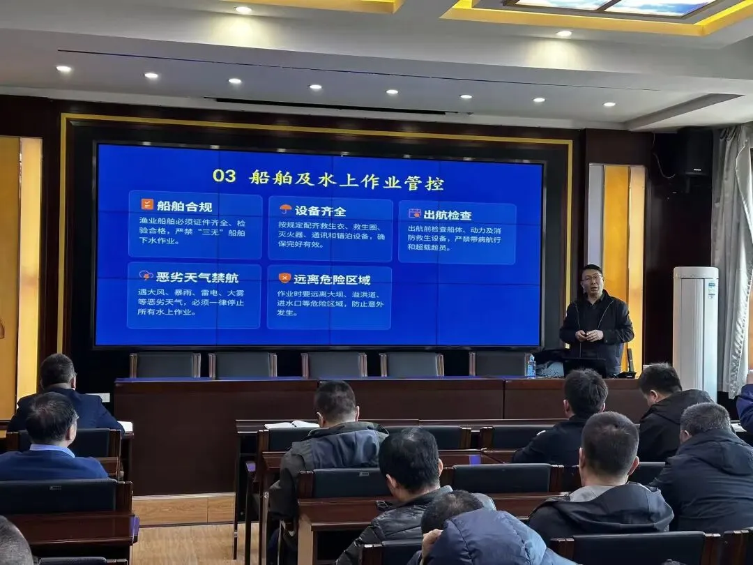 观音阁水库局公司在渔业生产复工准备就绪之际,为进一步规范水上作业管理,增强隐患防控意识,助推公司生产经营与风险管控再上新台阶,于3月18日组织开展了“渔业生产安全管控专题培训”。公司分管领导,相关部门人员,养殖总场捕捞及护库人员参加。