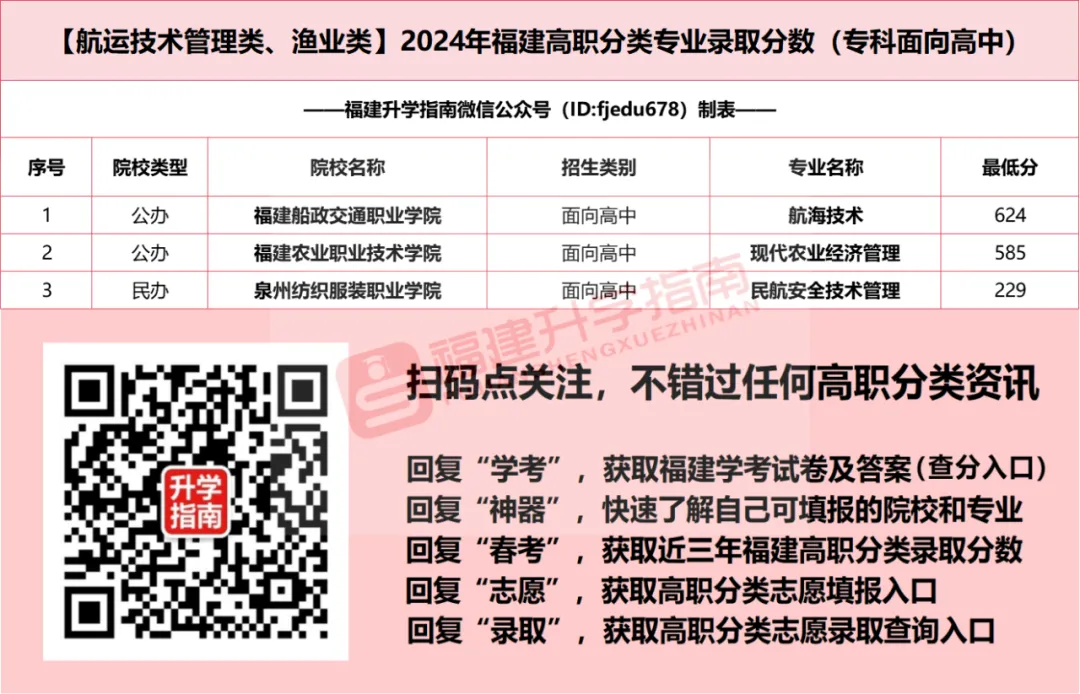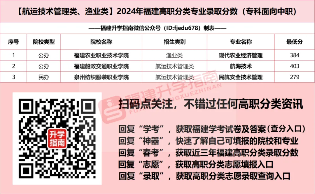 近期,福建升学指南(ID:fjedu678)将推出高职分类志愿填报科普系列篇,为同学们挑选出大家比较感兴趣的热门高职专业大类进行科普,本期为大家整理了“x航运技术管理类、渔业类”分专业介绍及分数汇总,感兴趣的同学往下看吧。