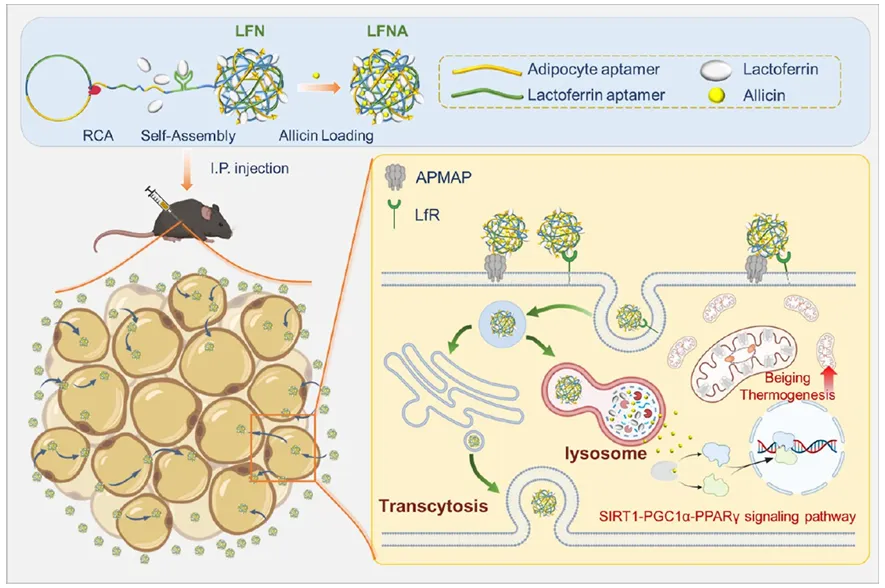 针对这一挑战,研究团队创新性地设计了一种能够同时识别脂肪细胞和结合乳铁蛋白的融合适配体,利用滚环扩增技术及适配体与乳铁蛋白的自组装,构建了负载大蒜素的乳铁蛋白-功能性核酸递送系统(LFNA)。在保持良好的脂肪组织靶向功能的基础上,利用乳铁蛋白受体介导的跨细胞转运功能,显著提升纳米载体在3D脂肪细胞球中的组织穿透能力,实现天然产靶向递送到脂肪组织的远端。此外,研究还提出了大蒜素可直接结合并激活SIRT1蛋白,诱导SIRT1 蛋白N端结构域向催化结构域闭合,从而激活SIRT1-PGC1α-PPARγ信号通路,促进线粒体生成和产热代谢。