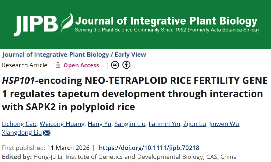 Cao, L., Huang, W., Yu, H., Liu, S., Yin, J., Lu, Z., Wu, J., Liu, X. (2026). HSP101-encoding NEO-TETRAPLOID RICE FERTILITY GENE 1 regulates tapetum development through interaction with SAPK2 in polyploid rice. J. Integr. Plant Biol.https://doi.org/10.1111/jipb.70218