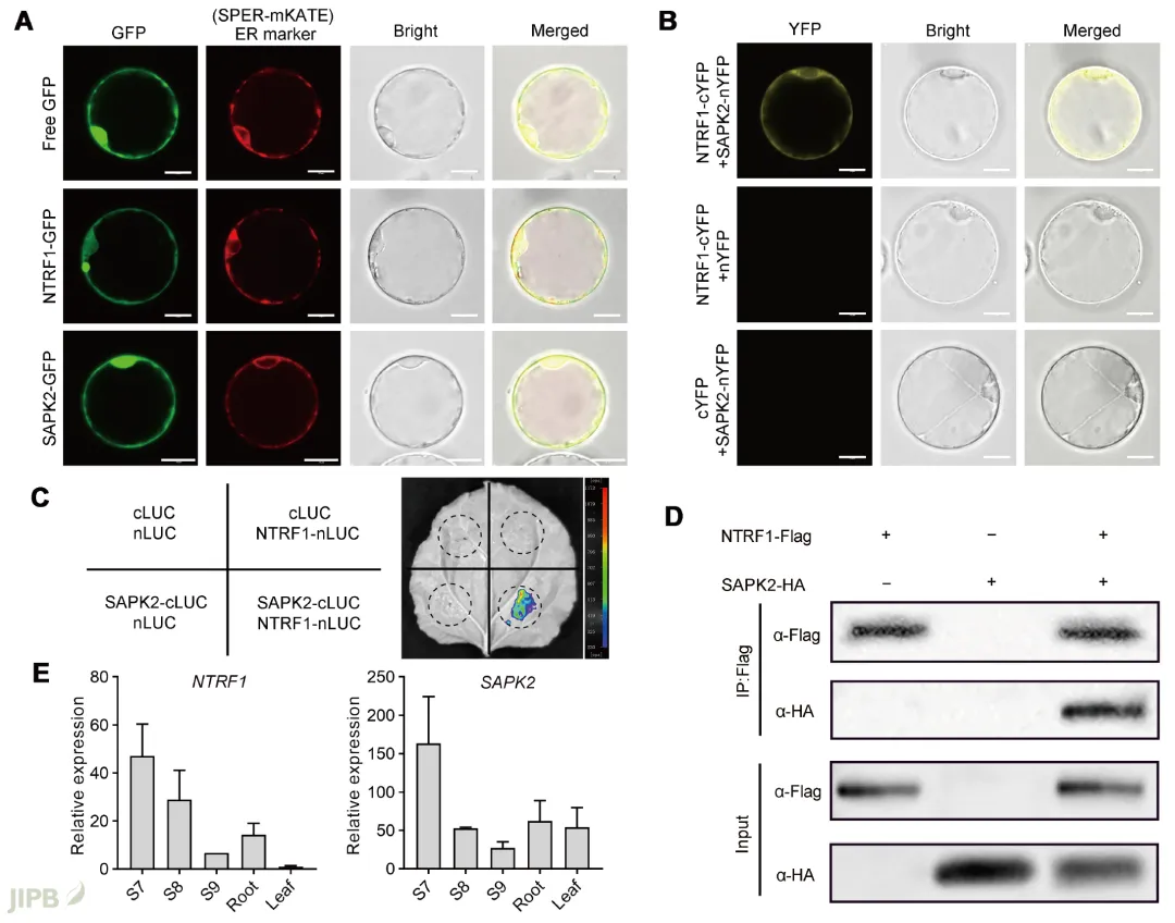 酵母双杂交、BiFC、LCI及Co-IP等实验证实, NTRF1可与ABA信号核心激酶SAPK2互作 (图2)。此外, 外源ABA处理可部分恢复ntrf1突变体的结实率, 表明NTRF1-SAPK2互作与ABA信号通路很可能是NTRF1调控新型四倍体水稻育性的关键。