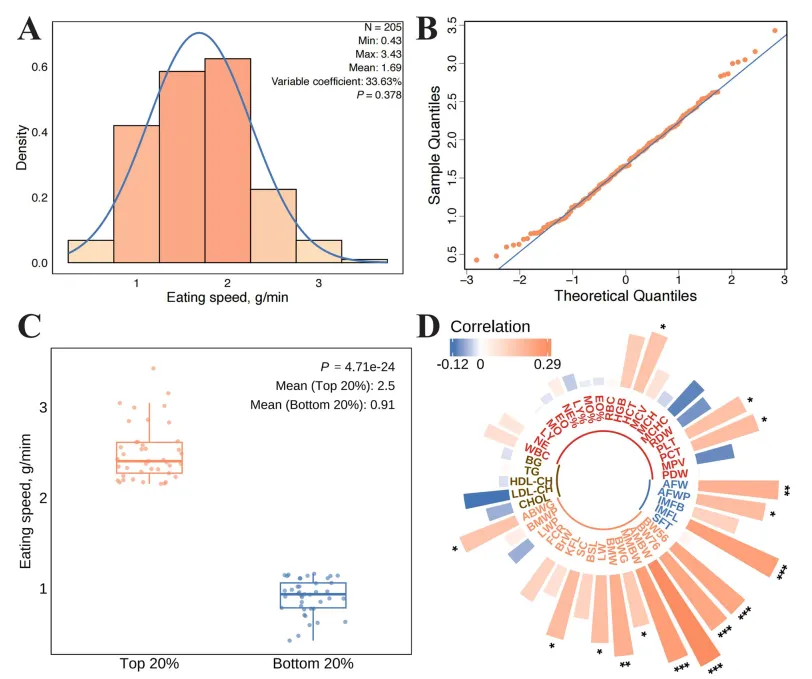 1、菌群关联分析:用双部分模型+极端组差异检验,筛选与进食速度相关的关键菌群。