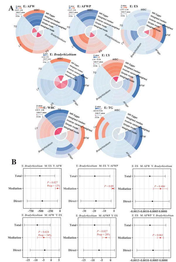 3、孟德尔随机化与中介作用孟德尔随机化分析证实了回肠慢生根瘤菌对进食速度和脂肪沉积的因果效应,并揭示了进食速度与脂肪沉积之间的双向正反馈循环。