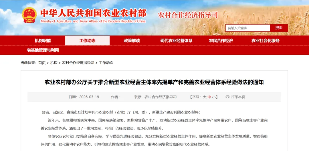 通知提到,各级农业农村部门要结合本地实际,认真学习借鉴先进经验做法,充分发挥新型农业经营主体示范引领作用,持续提升其发展质量,进一步增强稳粮保供核心能力,强化带动小农户发展的水平,加快构建支撑当地主导产业发展、带动农民增收致富的现代农业经营体系,为保障粮食安全和乡村产业振兴筑牢经营体系根基。