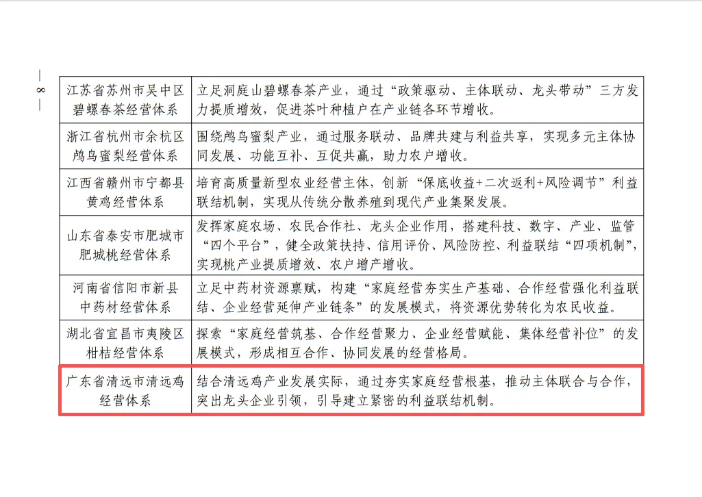 近日,农业农村部办公厅印发《关于推介新型农业经营主体率先提单产和完善农业经营体系经验做法的通知》,总结并推介各地新型农业经营主体在率先提升粮食单产、完善农业经营体系方面的可复制、可推广的经验做法。其中,清远市清远鸡经营体系入选获全国推介。