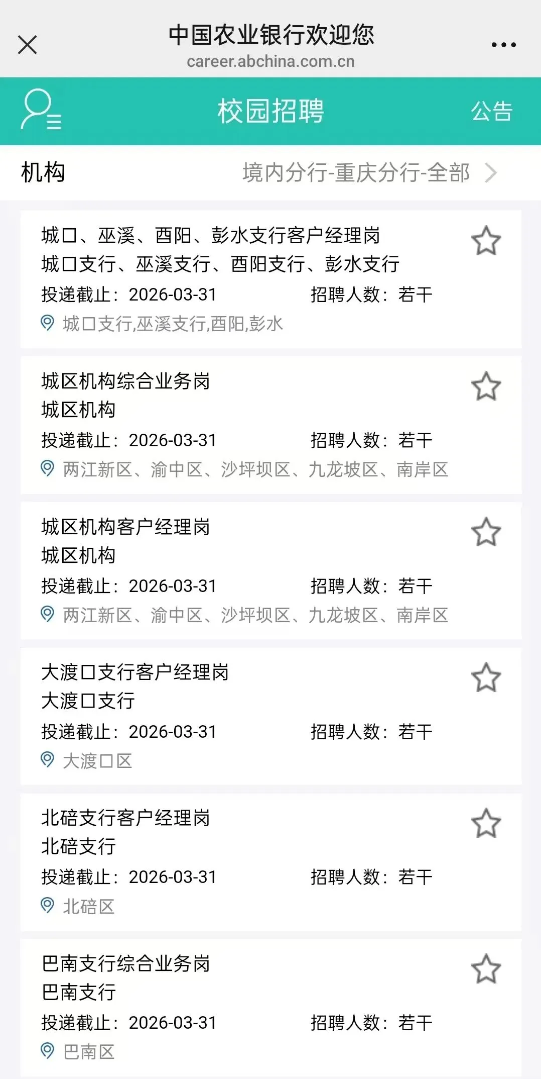 报名方式:应聘者请登录中国农业银行招聘网站(https://career.abchina.com.cn)或“中国农业银行人才招聘”微信公众号在线注册、填写简历并投报岗位。每名应聘者最多可投报两个岗位。