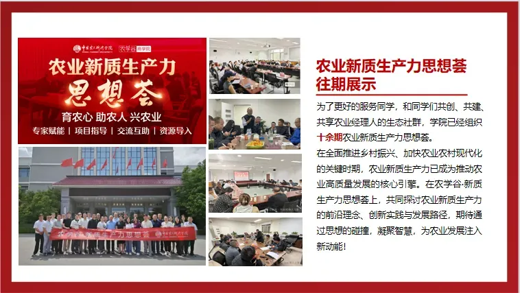 农学谷商学院农学谷商学院首开农业经营型商学院之先河,集合百名各专业领域实战型导师,摸索出一套针对一二三产业融合发展的实效型教学体系,基地及案例项目超百家。培养了一大批活跃在生态农场、农产品加工、休闲农业、乡村民宿、乡村美食、乡村旅游、文创设计等经营人才,构建出丰富的乡村创业生态。