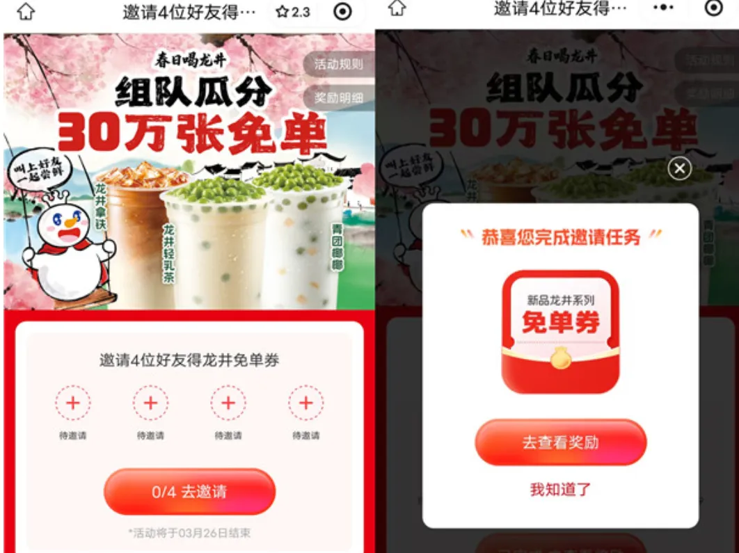 蜜雪冰城邀请4个好友助力,瓜分30万份奶茶免单券