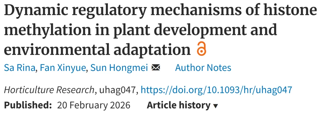 2026年第5期,Horticulture Research 在线发表了沈阳农业大学园艺学院孙红梅教授团队题为Dynamic regulatory mechanisms of histone methylation in plant development and environmental adaptation 的综述文章。该文系统梳理了组蛋白H3K4、H3K9、H3K27和H3K36位点关键甲基化修饰在调控植物休眠以及胁迫响应中的功能特征,并整合了组蛋白甲基化与光信号、激素途径及TOR信号通路之间的调控关系,构建了组蛋白甲基化参与多重信号交汇的网络模型,提出其作为整合代谢、环境与发育信号的动态调控中枢的重要作用。