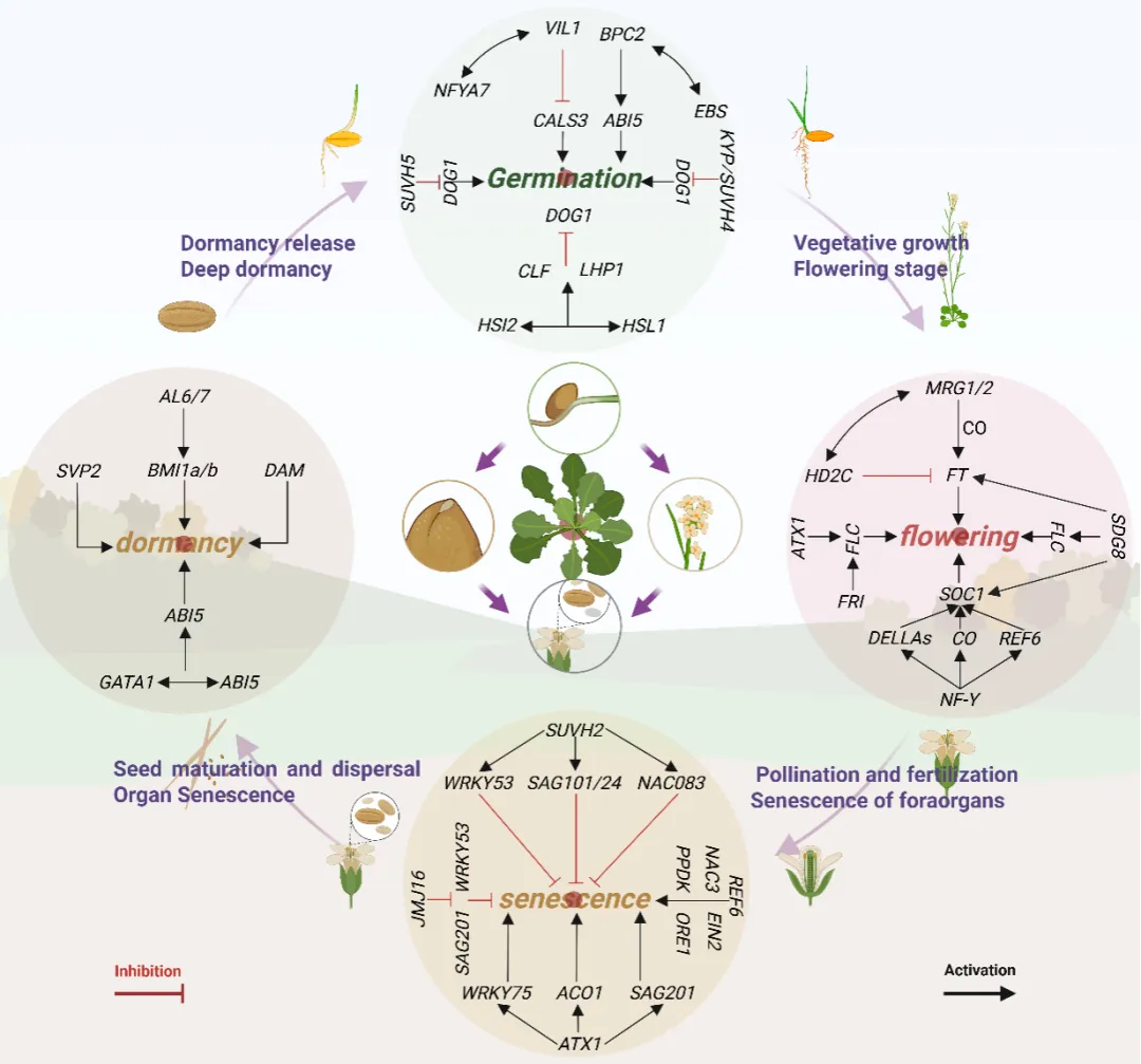 植物从休眠、萌发到开花及衰老关键发育阶段的转换,依赖于染色质水平的精细调控。组蛋白甲基化修饰,如H3K27me3、H3K4me3和H3K36me3等,通过动态调控染色质状态,决定发育相关基因的时空表达模式。在种子休眠调控中,PRC2复合体介导的H3K27me3沉积可抑制DOG1、ABI5 等基因,从而调控实现休眠的维持与解除;在多年生植物芽休眠中,H3K4me3的动态变化亦发挥重要作用。开花调控网络中,FLC 基因的表达受H3K27me3与H3K4me3的双重调控,ATX1催化H3K4me3促进其表达,而PRC2介导的H3K27me3则维持其沉默;春化过程中TOR信号与PRC2协同作用,进一步强化这一调控网络。在器官衰老进程中,SUVH、JMJ 、REF6 等组蛋白修饰因子通过调控衰老相关基因及乙烯信号通路组分,参与衰老进程的时序调控(图1)。
