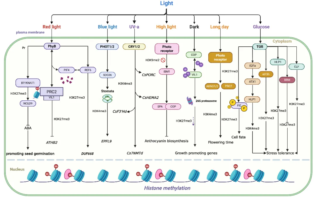 该文进一步指出,组蛋白甲基化修饰并非孤立发挥作用,而是与光信号、TOR能量通路及激素网络紧密交织,共同构成多维调控体系。在光信号转导中,光受体phyB可通过VIL1-PRC2模块或与REF6、PIF协同作用,调节H3K27me3在关键基因位点的沉积与去除,从而精准控制生长与开花进程;蓝光及UV-A则通过H3K4甲基化影响叶片发育与代谢重组。与此同时,葡萄糖激活的TOR通路通过调控ATX1、CLF 及PRC2活性,动态重塑H3K4me3与H3K27me3水平,在生长与应激响应之间实现能量分配与转录重编程。该整合模型揭示了环境信号、代谢状态与表观遗传修饰之间的深度耦合,为精准调控植物发育与抗逆性提供了新的理论框架(图3)。