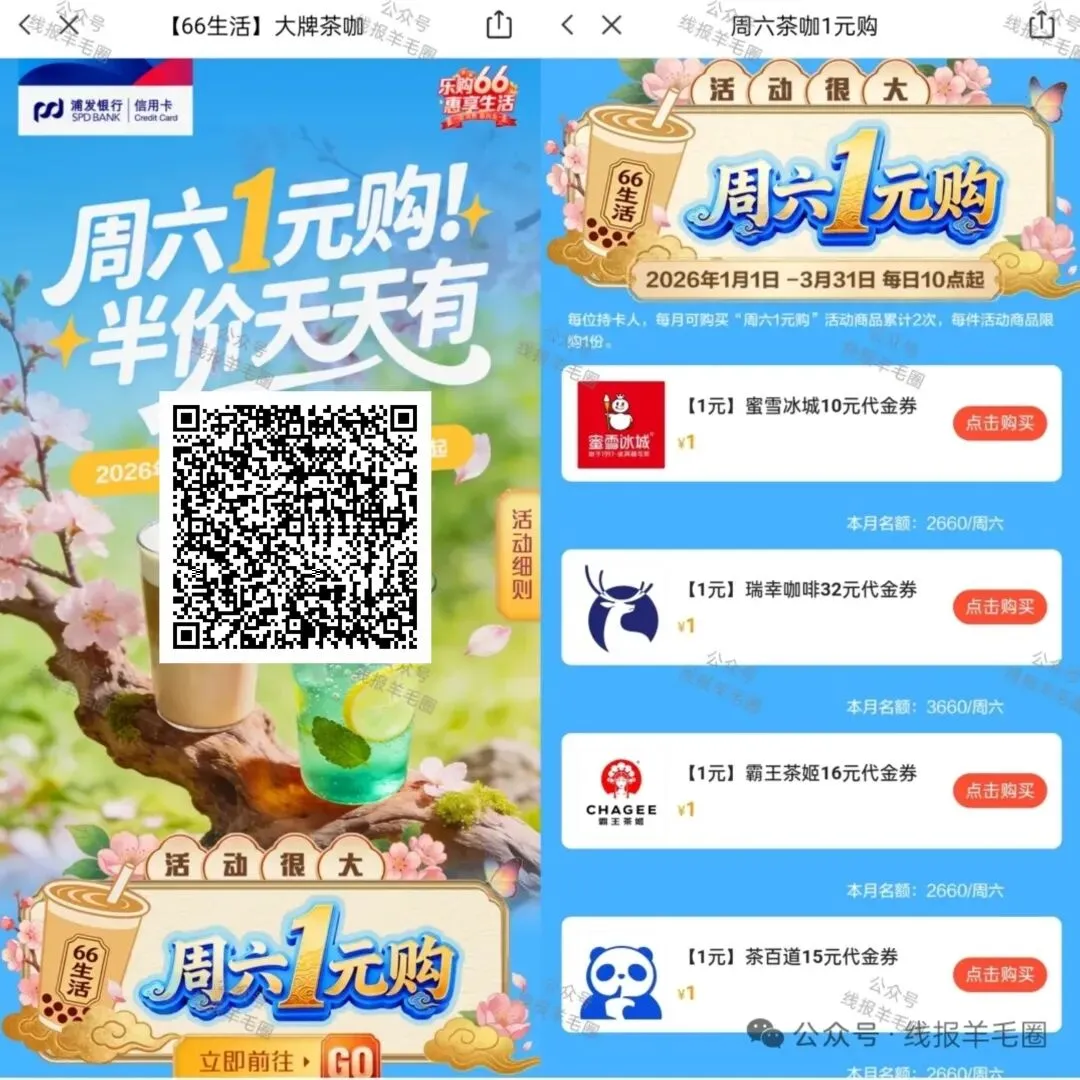 这个月继续参与!浦发信用卡周六1元喝奶茶!