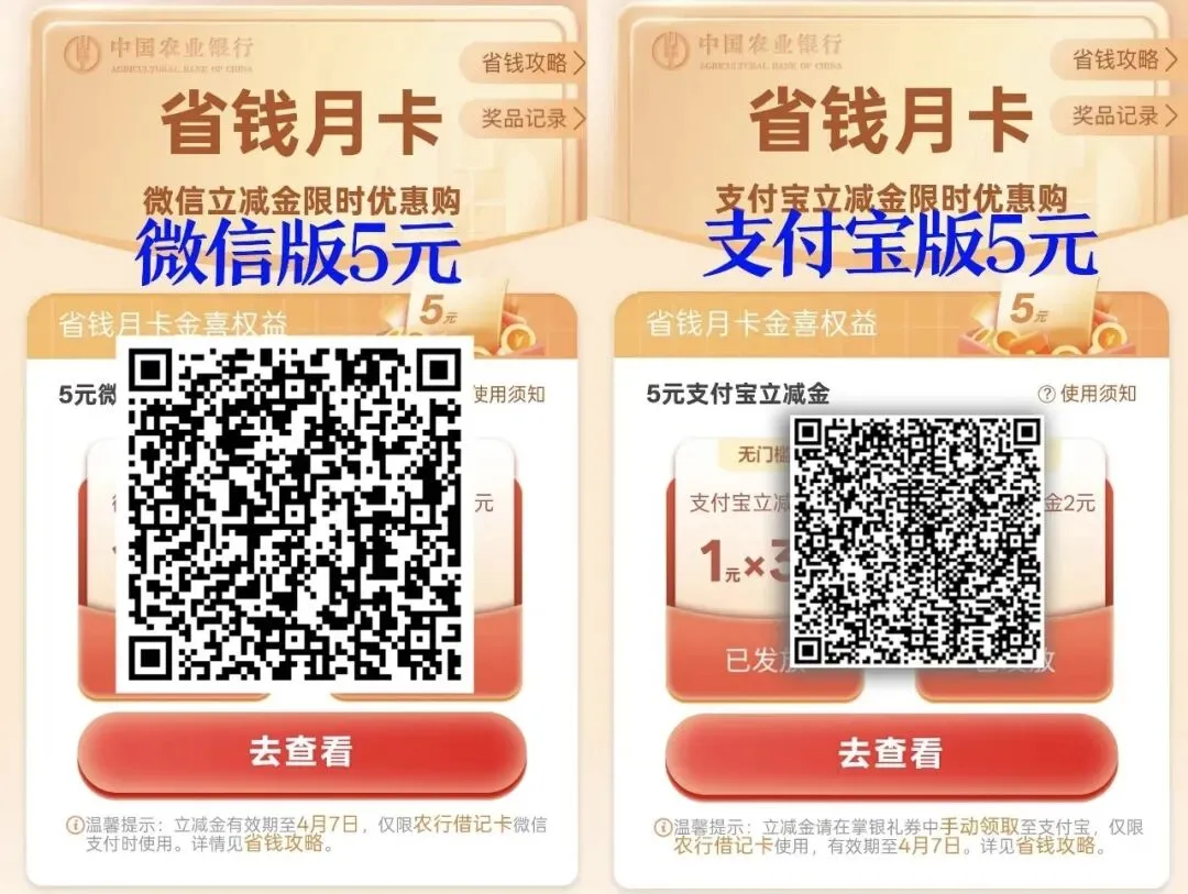 农行三款省钱月卡上线: