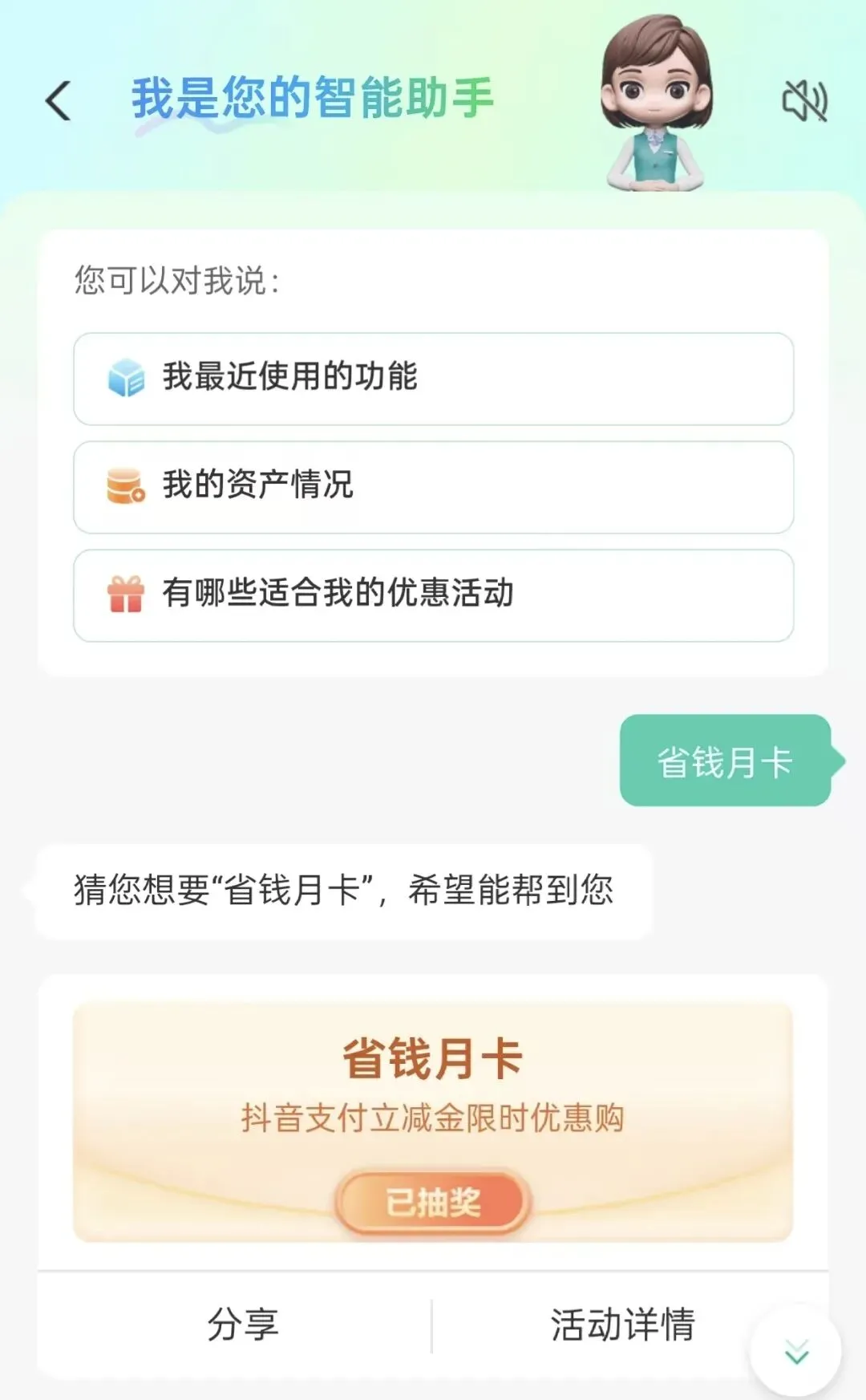 2.抖音券在农行APP首页下拉智能助手,回复“省钱月卡”购买。